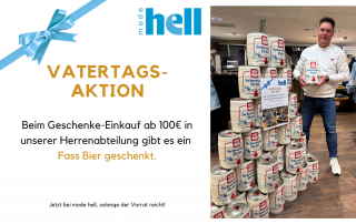 Beim Geschenke-Einkauf ab 100€ in unserer Herrenabteilung gibt es ein Fass Bier geschenkt! Ab sofort, solange der Vorrat reicht.
