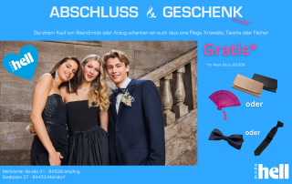 ✨ Gratis Geschenk-Aktion ✨ Steht der Abschlussball an und du hast noch kein Kleid oder Anzug? Eine große Auswahl an Abendmode findest du jetzt bei mode hell und erhälst sogar eine gratis Fliege, Krawatte, Tasche oder einen Fächer im Wert bis zu 29,95€ dazu geschenkt!