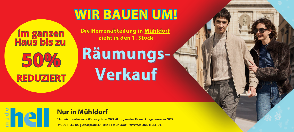 Unsere Herrenabteilung in Mühldorf zieht in den 1. Stock – machen Sie jetzt ein Schnäppchen, damit wir Platz für den Umbau haben. Im ganzen Haus findet ein großer Räumungsverkauf statt!